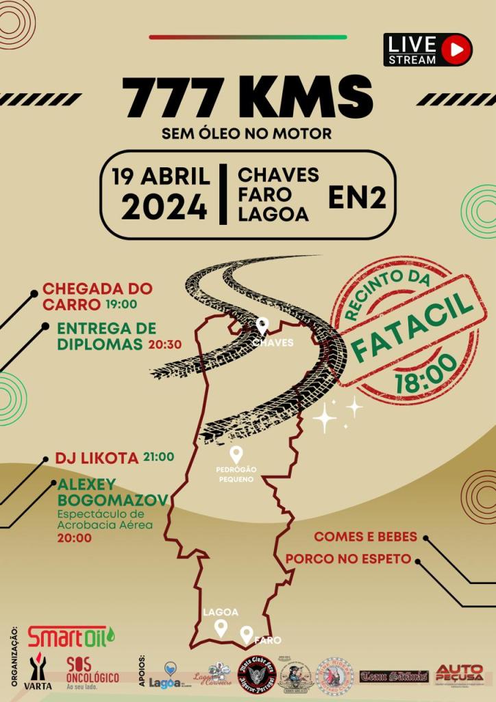 Às 9 horas do dia 18 de abril de 2024, no nosso Fiat Punto com motor 1,2 a gasolina tratado com aditivos SmartOIL, retiraremos o óleo do cárter a frente dos espectadores, e o carro deixará Cháves sem óleo até ao chegar a Pedrogao Pequeno. De manhã do dia 19 de abril de 2024, o veículo continuará no percurso ROUTE PORTUGAL EN2 até chegar a Faro e fica acompanhada com escorte motociclistas ate FATACIL em Lagoa (Algarve) sem óleo no cárter. Finalmente, a tampa de drenagem de óleo do cárter vai ser removida para verificação, que realmente não havia óleo dentro do cárter! A seguir vai aparecer um espetáculo fantástico do teatro de shows aéreos “AB”, que vai ser feito desde 19h ate a musica esta acabar do DJ LIKOTA!